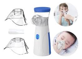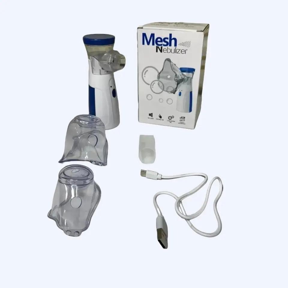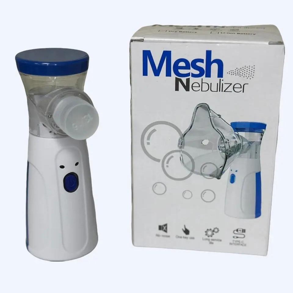Increible Nebulizador de Malla Portatil de Tamaño Compacto Ideal para Llevar de Viaje, en su empaque encotrarás dos máscarillas de diferente tamaño para usar en Adultos o Niños.
